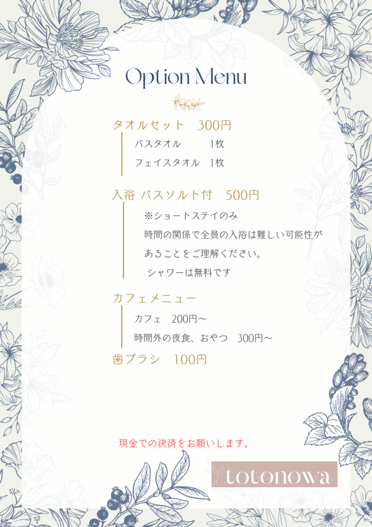 • 30分以上遅刻された日はスタッフで行う沐浴ができない場合がありますので、ご注意ください。